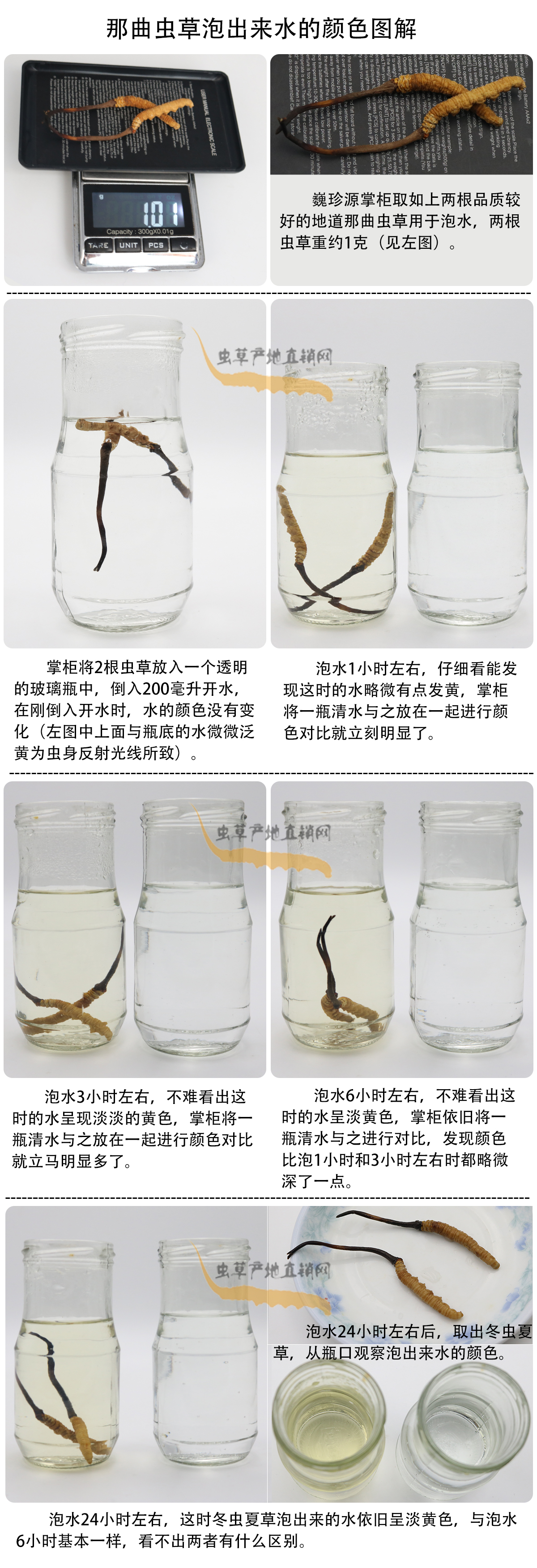 冬蟲(chóng)夏草泡水是最常用的服用方法,有些細(xì)心的顧客在冬蟲(chóng)夏草泡水過(guò)程中觀察水的顏色變化,并向我們提出了一些疑問(wèn)。為了掌握第一手資料,更客觀準(zhǔn)確的回答大家的疑問(wèn),巍珍源掌柜親自試驗(yàn)冬蟲(chóng)夏草泡水過(guò)程(以那曲冬蟲(chóng)夏草作為試驗(yàn)樣本),并拍下水的顏色變化照片,請(qǐng)大家先看照片,然后巍珍源掌柜再就幾個(gè)重要問(wèn)題進(jìn)行解答,照片如下: